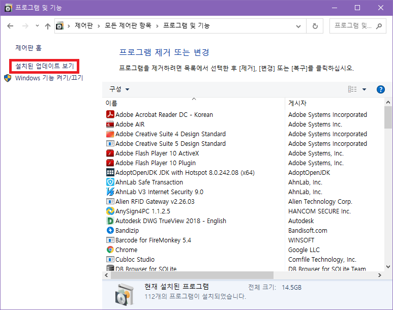 제어판 - 프로그램 및 기능을 클릭하고 설치된 업데이트 보기를 선택합니다.