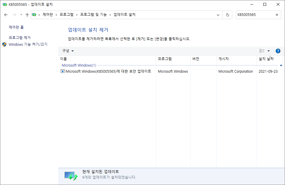 우측 상단에 KB5005565를 입력하여 설치된 보안 업데이트를 우측 마우스 눌러서 제거를 해주면 됩니다.
