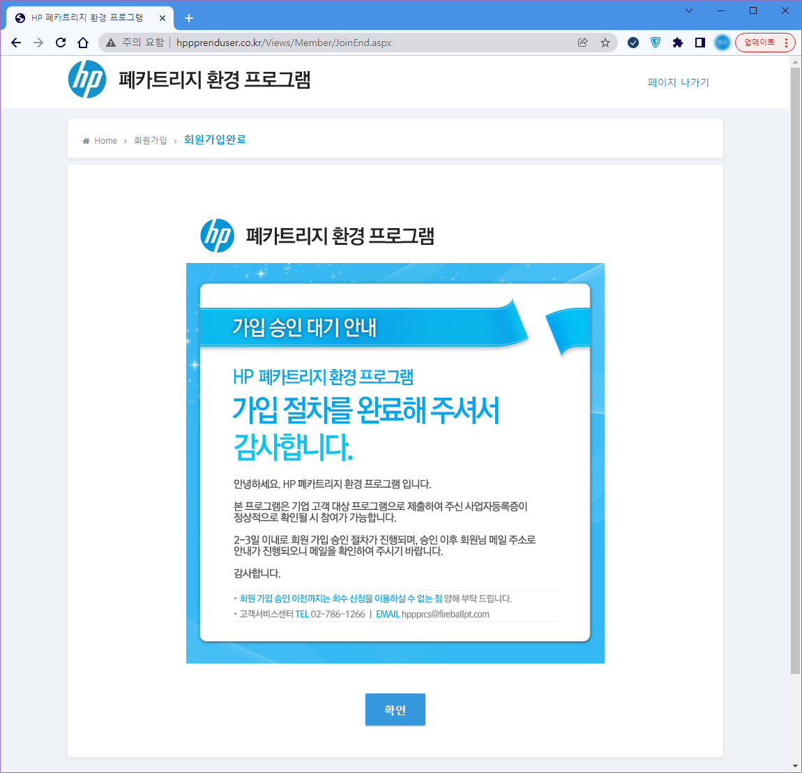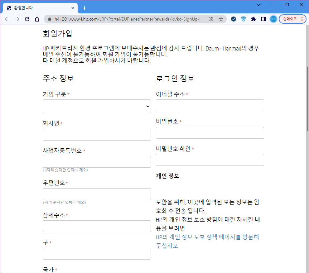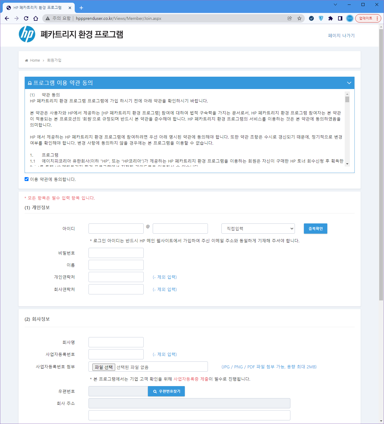 회수 신청을 하기 위해 실제 사업자 인증이 필요하고 HP 폐카트리지 환경 프로그램에 사용하기 위한 회원가입이 필요합니다.
