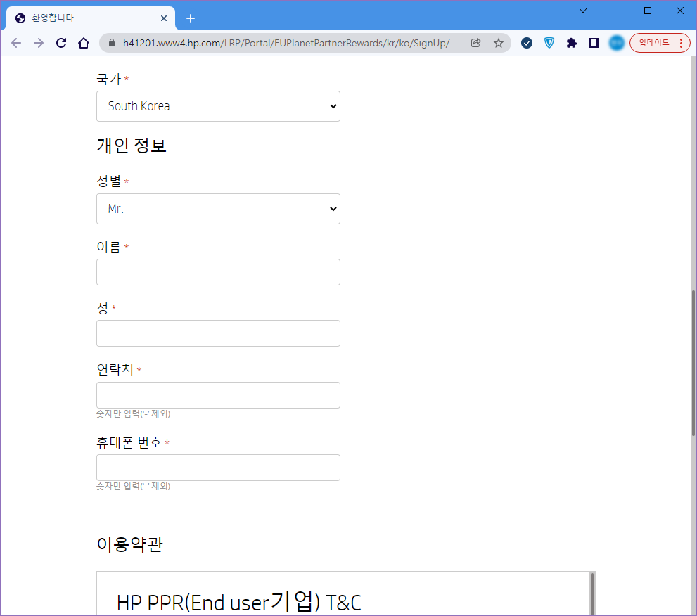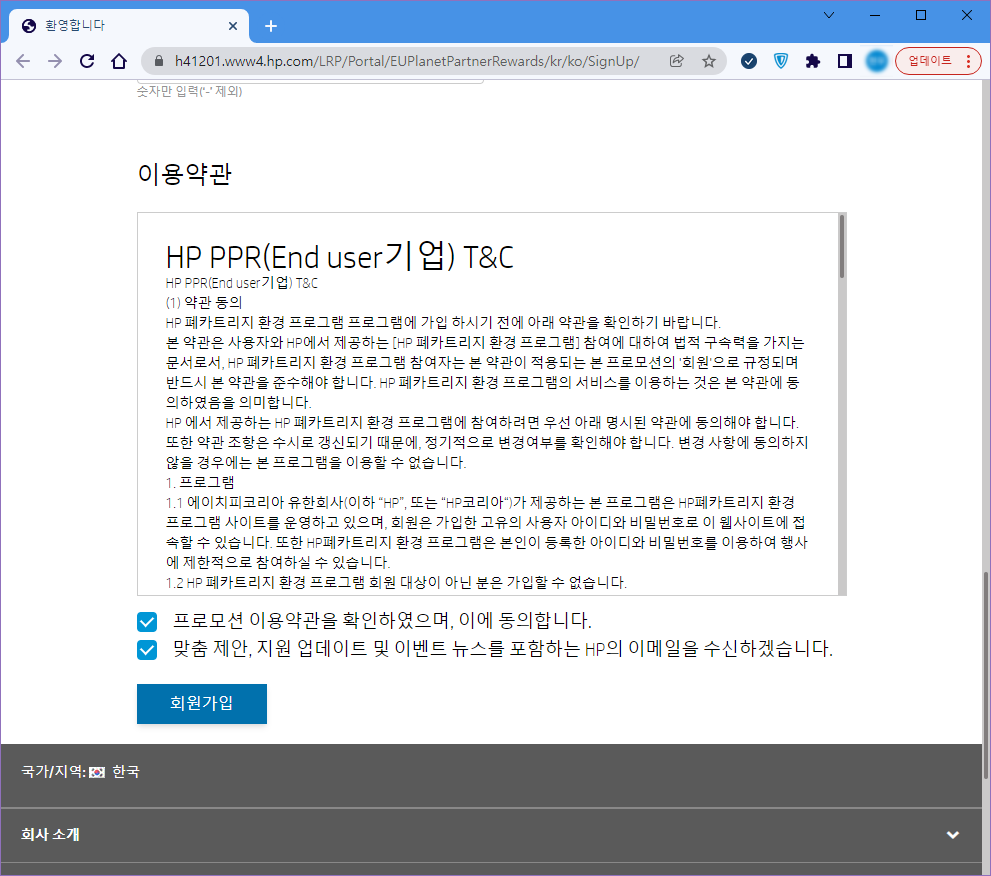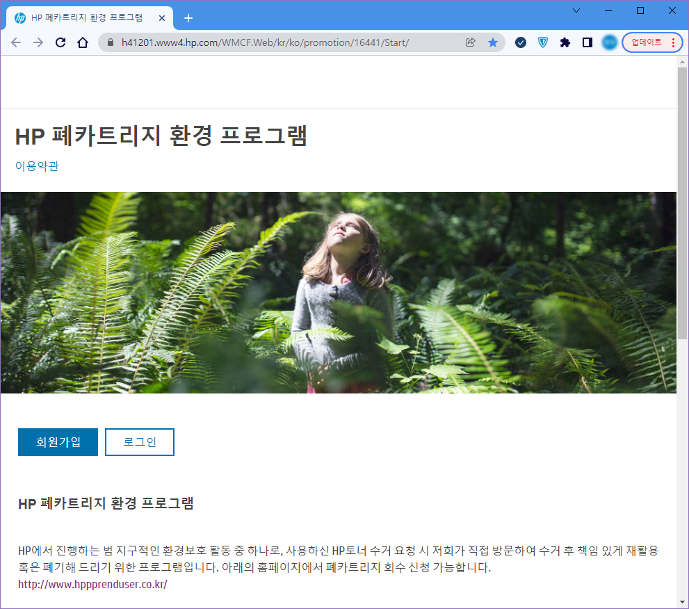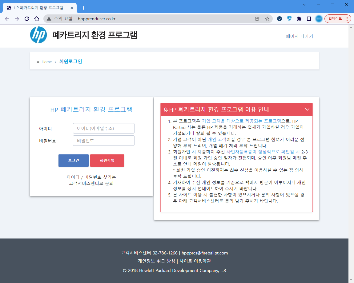 HP 폐카트리지 환경 프로그램은 일반적인 개인은 가입할 수 없고, 기업이나 공공부문 회원만 가입이 가능합니다.