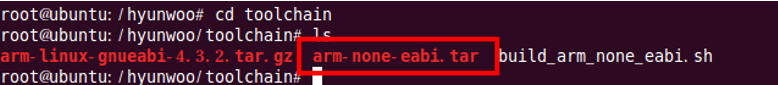 먼저 부트로더를 컴파일 하기 위해서 toolchain 디렉토리로 이동하여 arm-none-eabi.tar 압축 파일을 루트 디렉토리로 복사해줍니다.