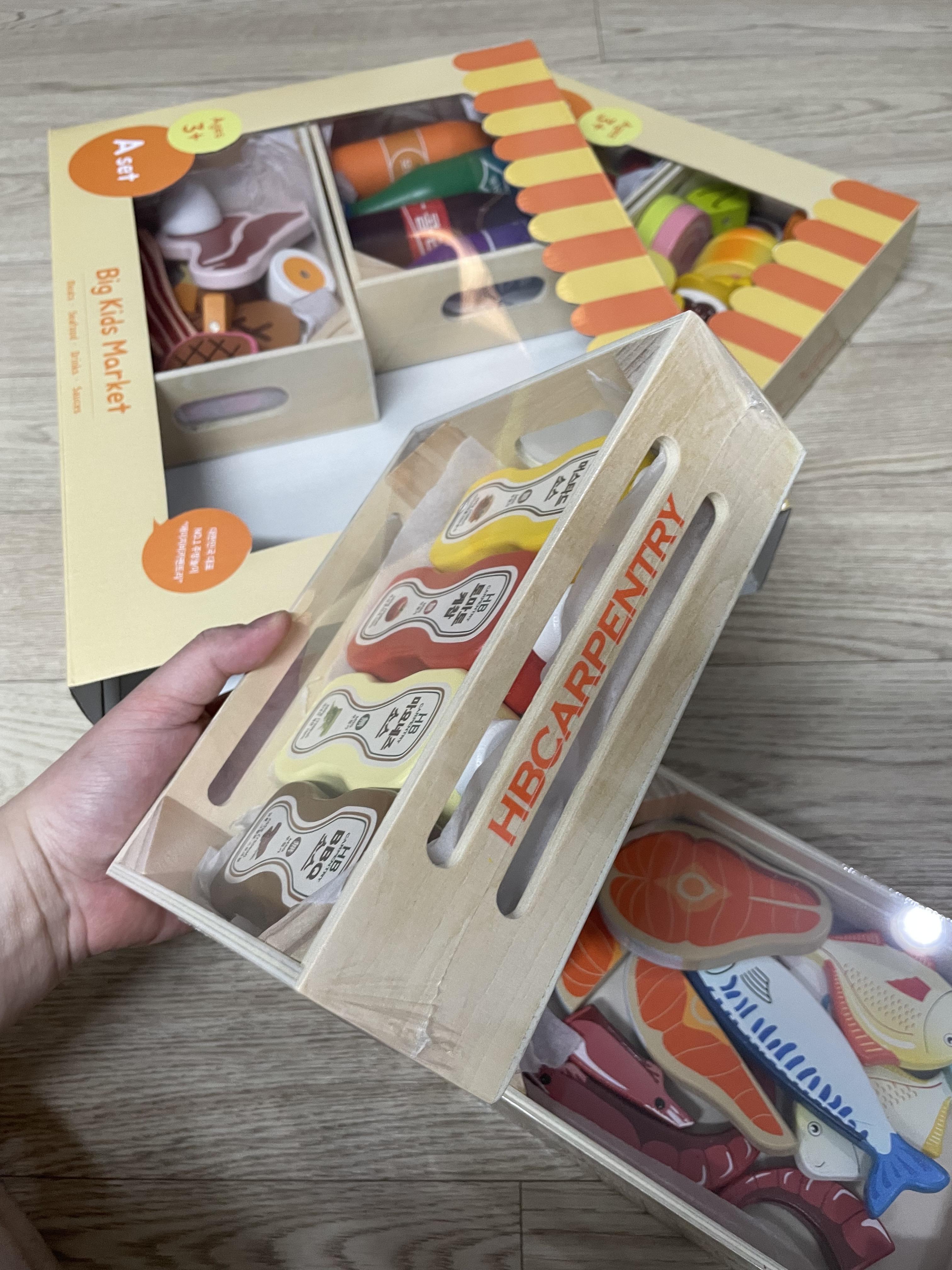 빅키즈마트 소품 A와 B는 아래 사진처럼 개별 포장 박스로 되어 있고 나무 트레이만 쏙 빼면 됩니다.