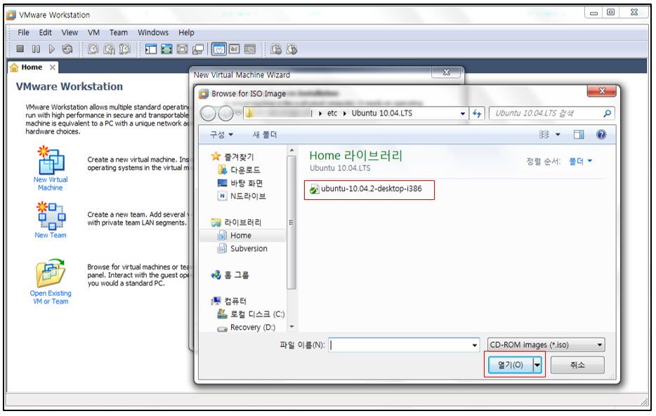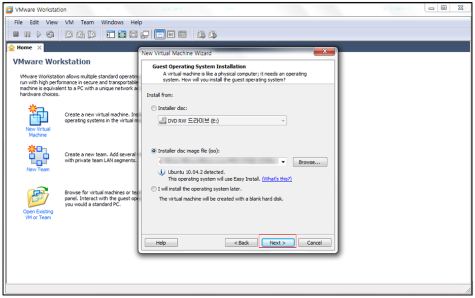 Installer disc image file (iso) 를 선택 후 Browse... 버튼을 눌러 Ubuntu 이미지 파일을 선택합니다.