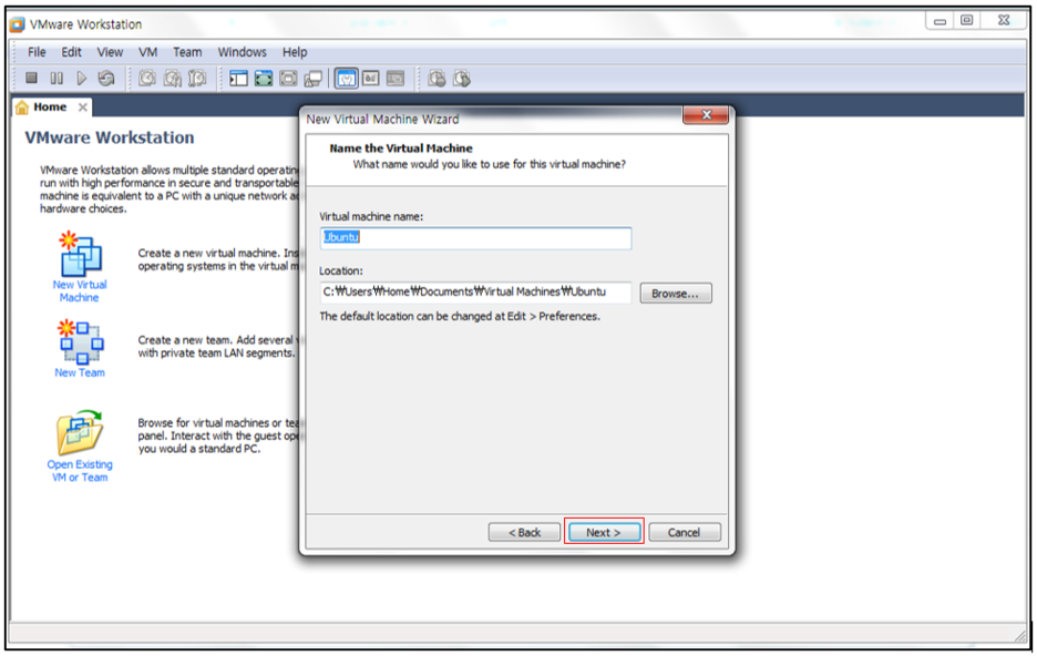 해당 가상머신의 명칭을 입력 후 Next 버튼을 눌러줍니다.