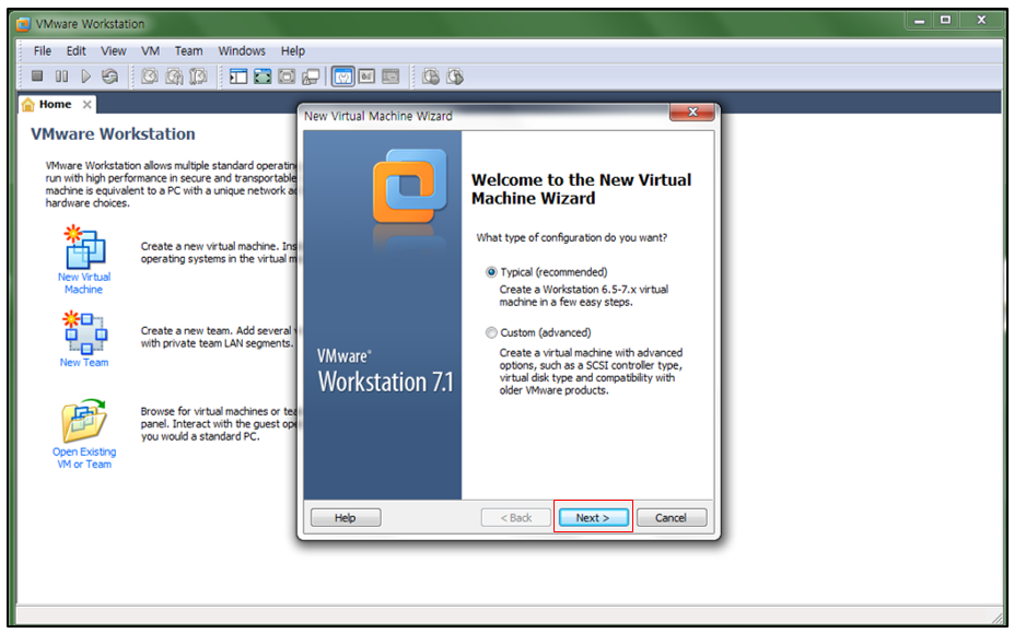 우선 VMware Workstation을 실행 시키고 New Virtual Machine을 선택합니다.