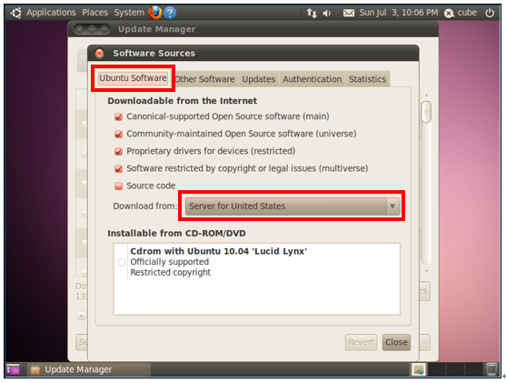 상단의 Update Software 탭을 선택하면 다운로드 서버가 어디로 지정되어 있는지 볼 수 있습니다.