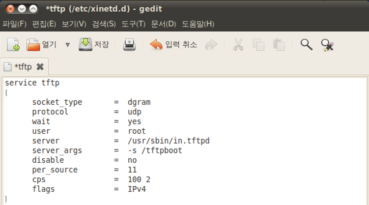 다음 명령어를 입력하여 gedit로 tftp 파일을 작성해줍니다.