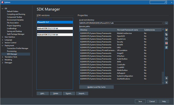Tools - Options 창을 열어주고 Depolyment - SDK Manager를 선택합니다. 기존에 추가된 iOS SDK를 선택하고 아래 리스트의 SDK를 추가해 줍니다.