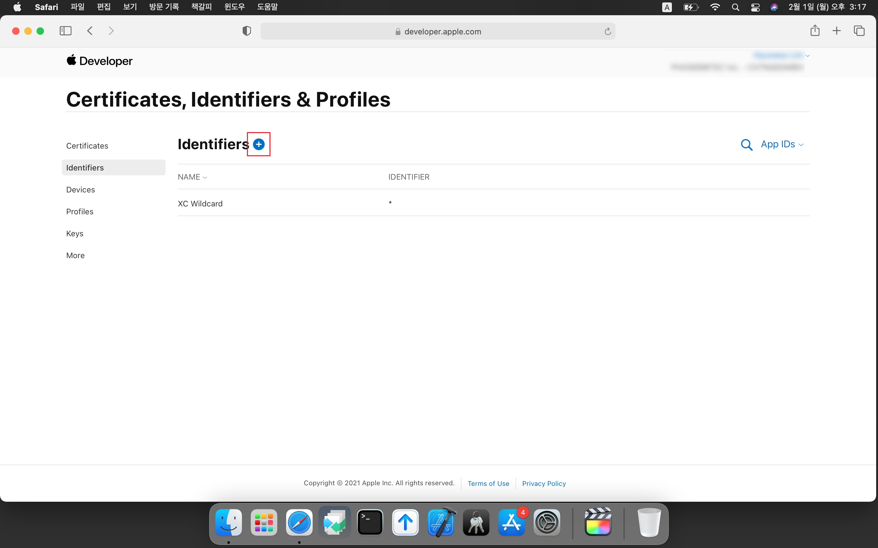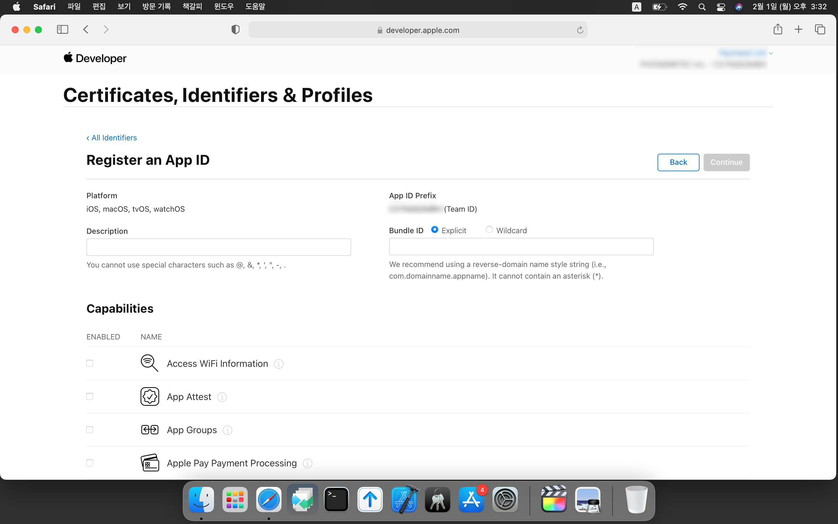 좌측의 Identifiers 메뉴를 선택하여 앱 명칭으로 App ID를 만들어 줍니다. App ID를 만들어야 개발 프로파일을 만들 수 있습니다.