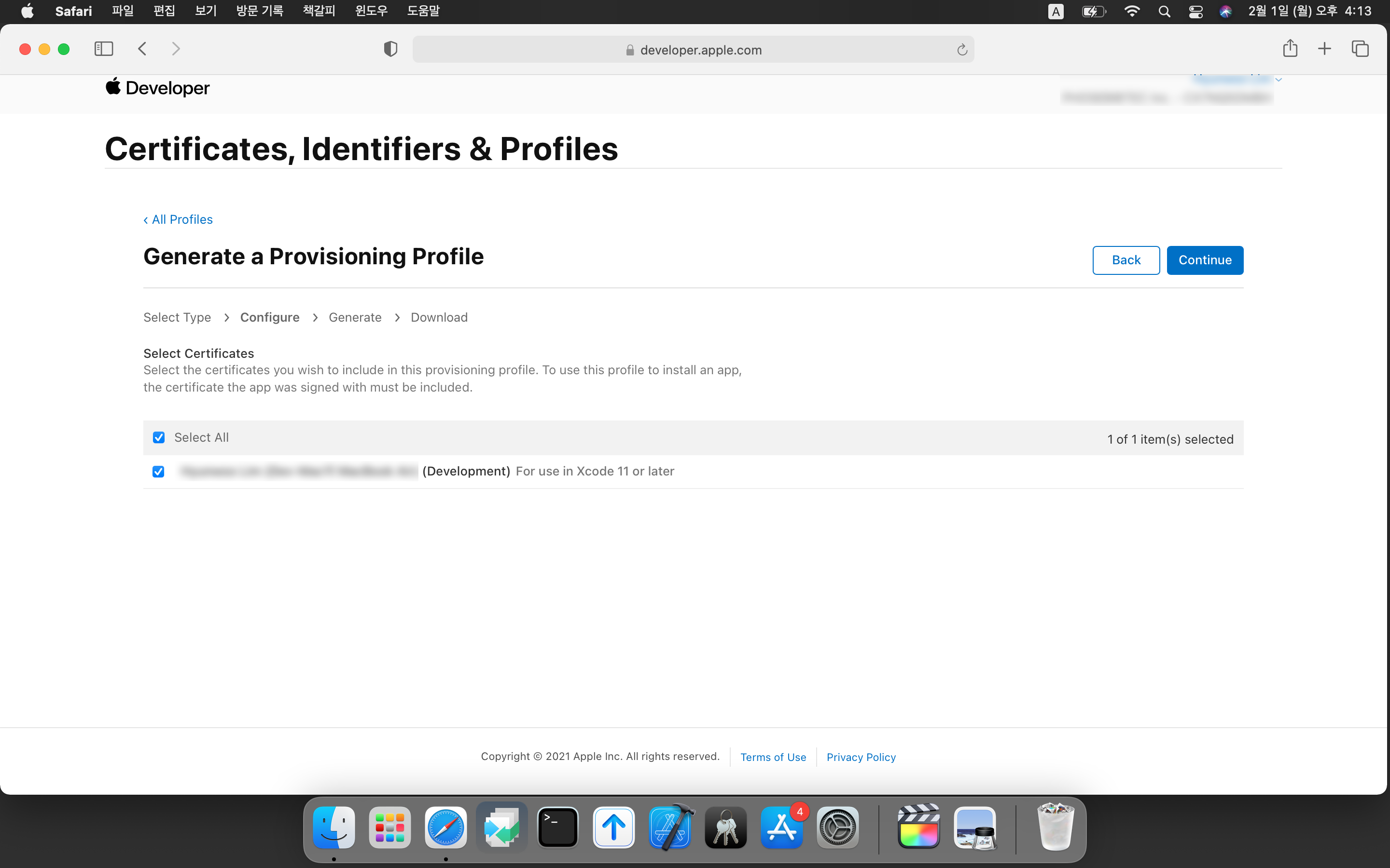 개발 인증서를 체크하고 Continue를 눌러줍니다.