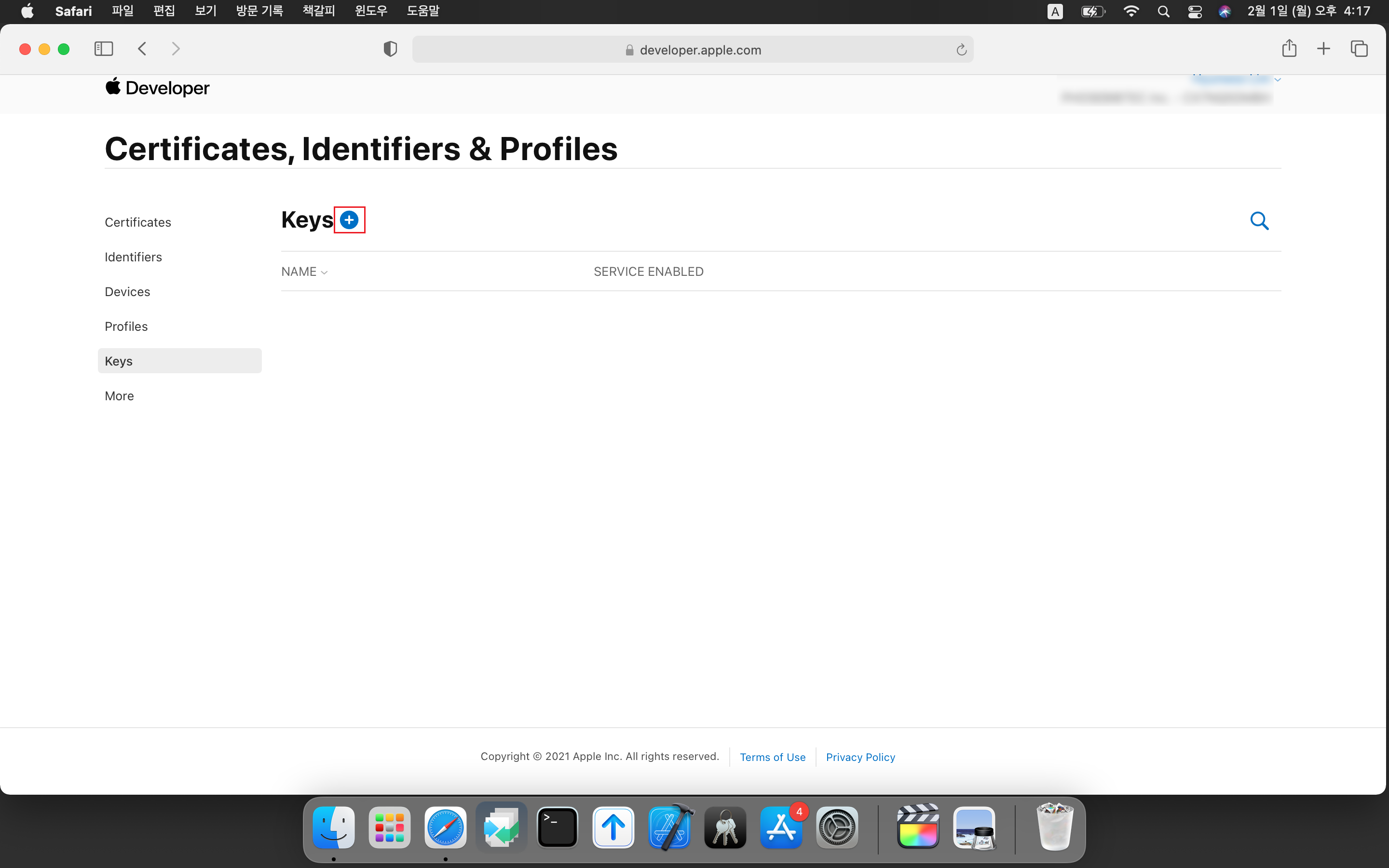 찾아보기를 눌러 키 파일을 업로드 해줍니다. 키 ID는 키 파일을 만들 때 표시되고 파일 명으로도 저장이 됩니다. 혹시나 파일명을 변경하셨다면 iOS 개발자 사이트를 다시 들어가서 생성해놓은 Key를 선택하면 확인 할 수 있습니다.