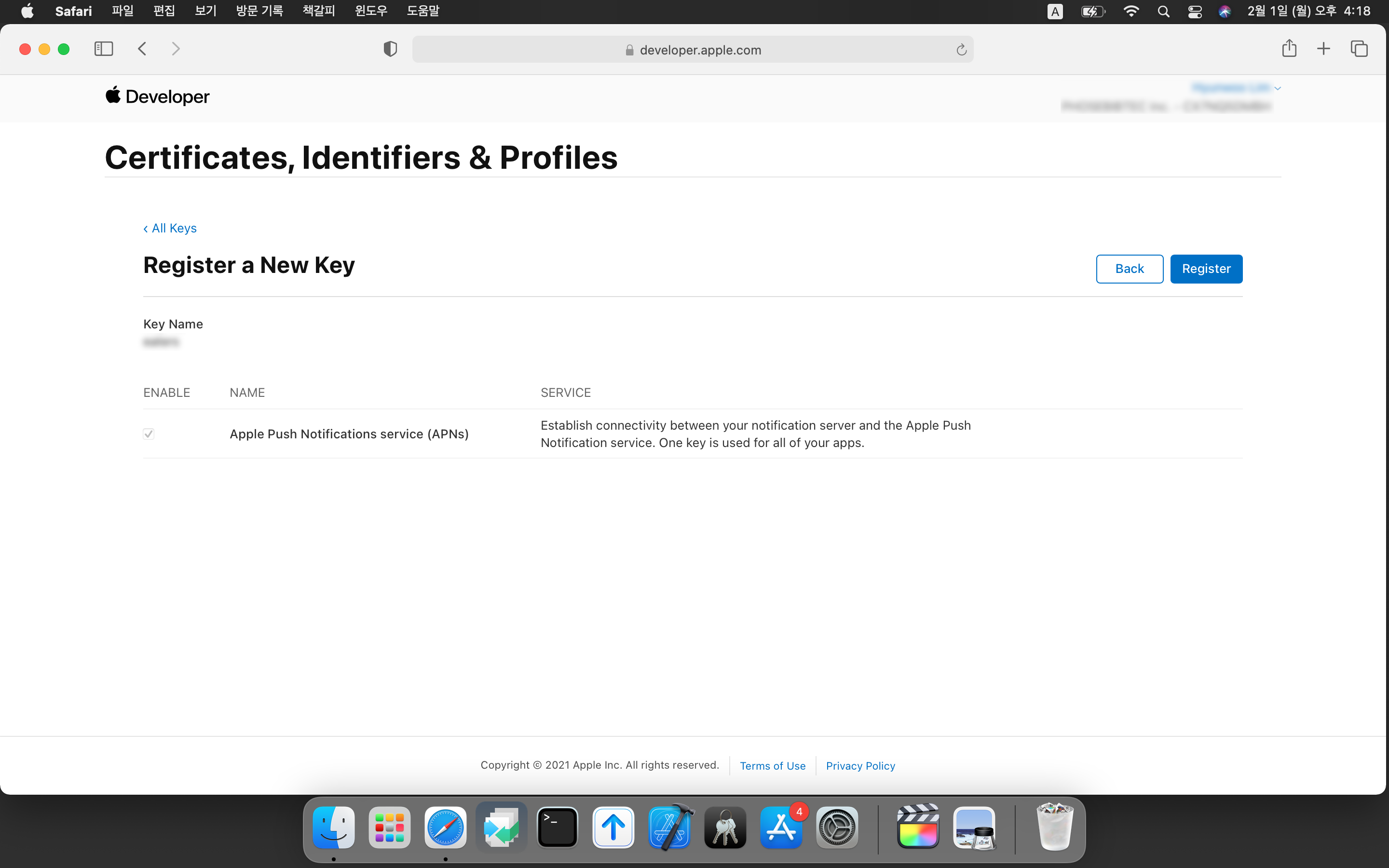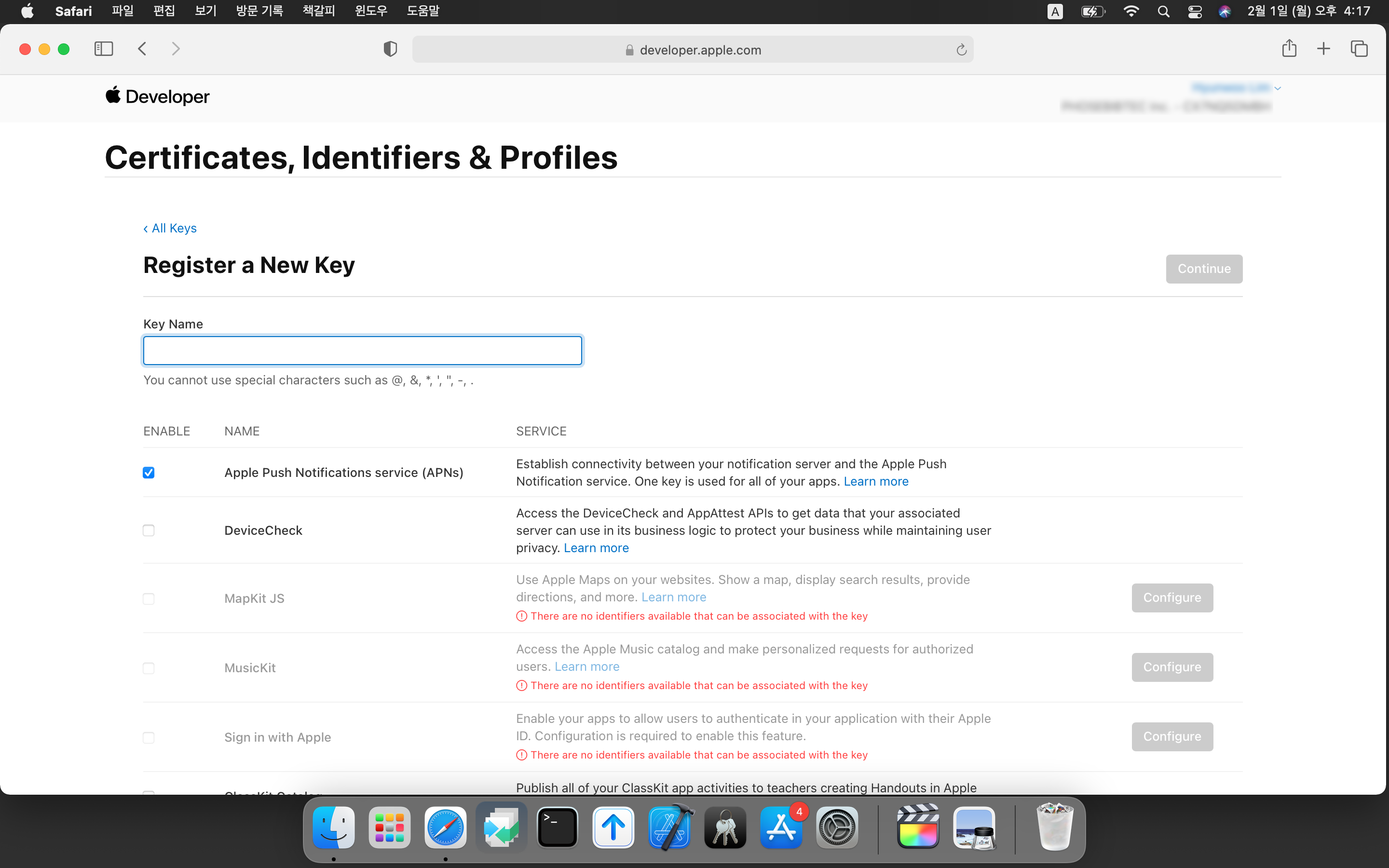 Apple Push Notifications service (APNs) 를 체크하고 Key Name에 키파일 명칭을 입력한 뒤 Continue 버튼을 눌러줍니다.