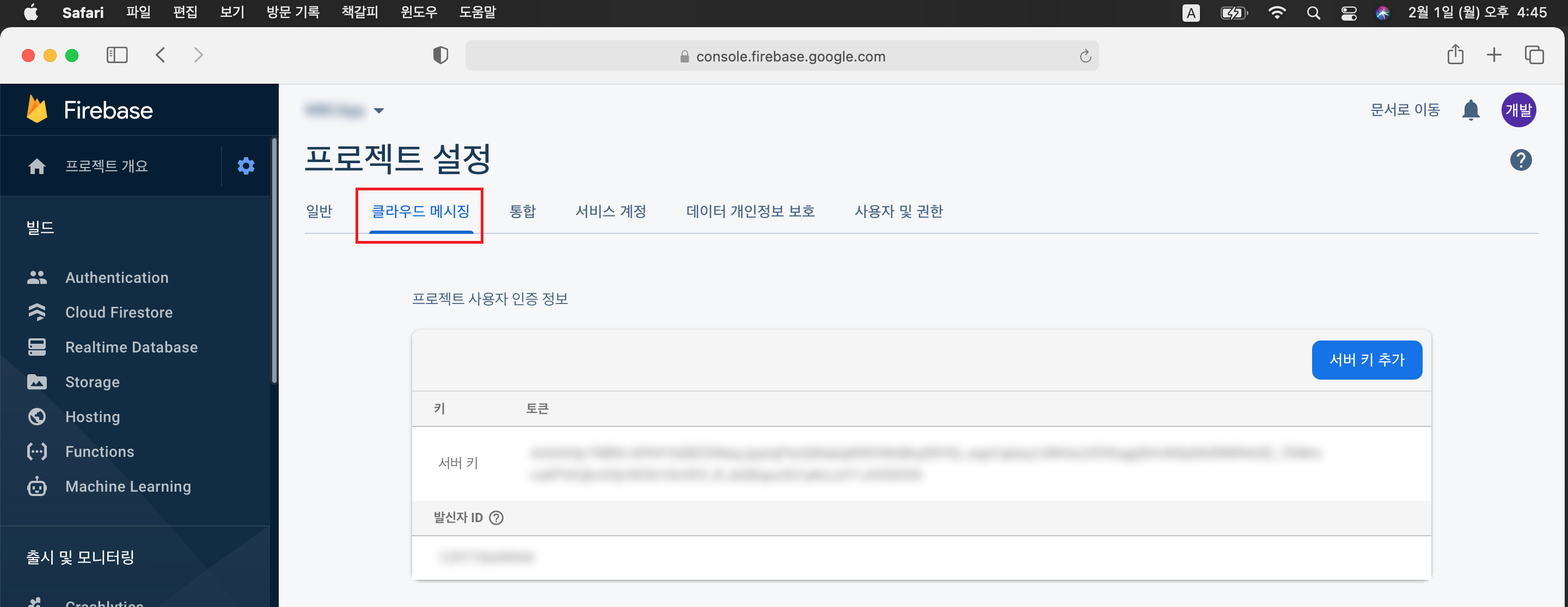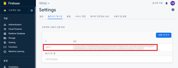 앱 푸시 서버를 구현하기에 앞서 우선적으로 FCM의 서버 키 값을 알아야 합니다. HTTP 프로토콜을 전송할 때 해더부분에 서버 키 값을 포함시켜야 FCM 클라우드 메시징이 제대로 동작합니다.
