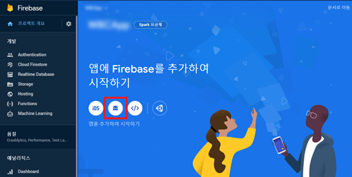 앱의 "Firebase를 추가하여 시작하기" 아래에 Android 아이콘을 선택합니다.
