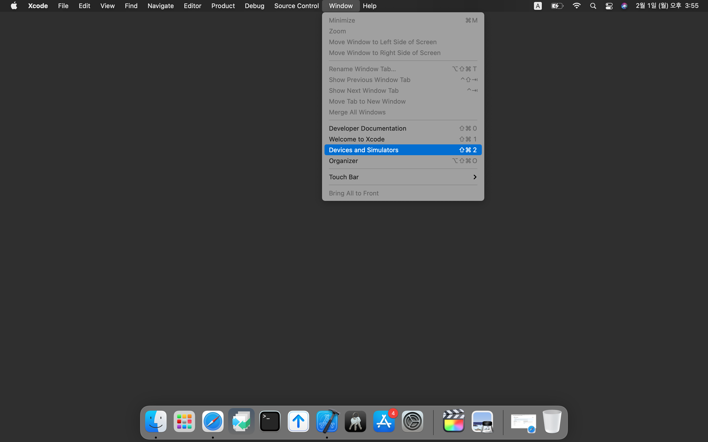 UDID를 확인하기 위해 XCode 상단 메뉴 Window - Devices and Simulators 를 선택해 줍니다.