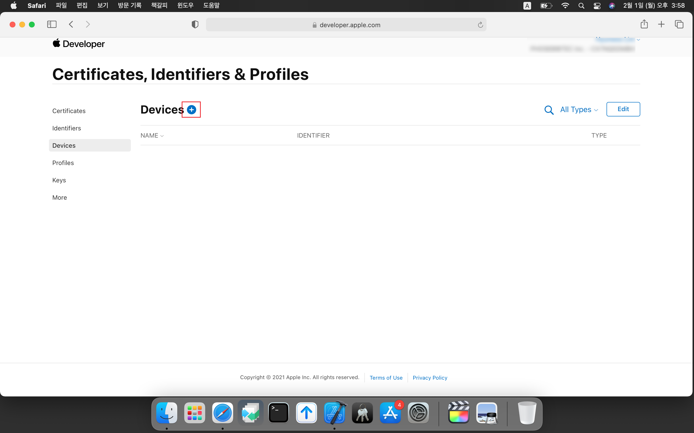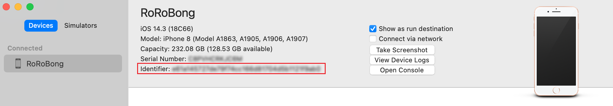 연결된 장치가 Devices에 표시되며 Identifier 에 나와있는 데이터가 Device ID(UDID) 입니다.