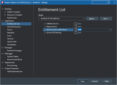이제 다운받은 Android 구성 파일을 프로젝트에 등록해 주어야 합니다. 델파이에서 Ctrl + Alt + F11 을 누르시면 프로젝트 옵션 창이 표시됩니다. 좌측의 Application - Services 탭을 선택하고, Import… 버튼을 눌러 google-services.json 파일을 지정해 줍니다.