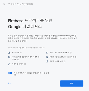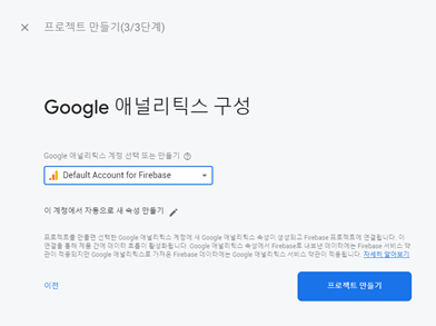 Google 애널리틱스 계정 선택에서 Default Account for Firebase를 선택 후 프로젝트 만들기 버튼을 눌러줍니다.