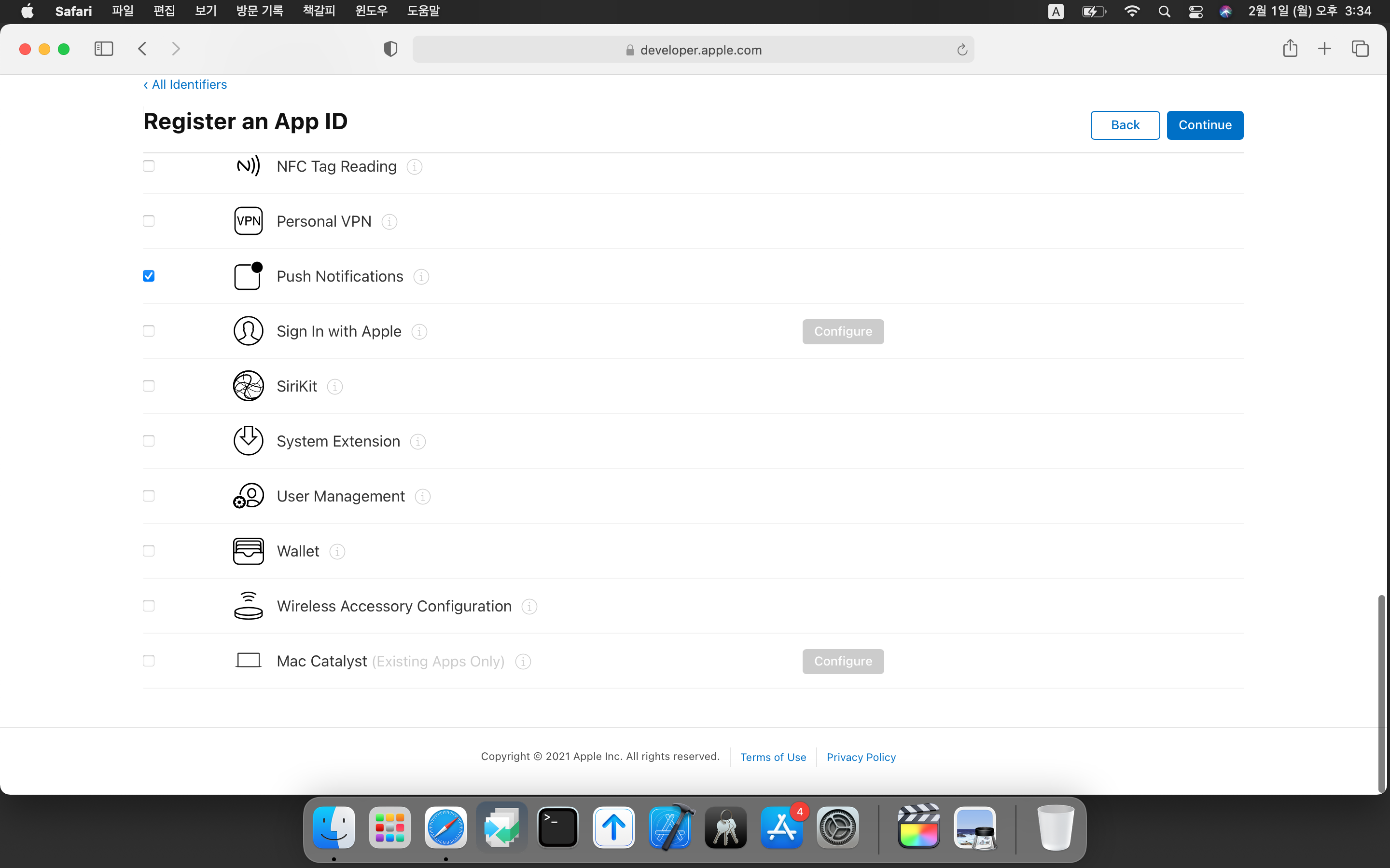 스크롤을 내리시면 Push Notifications 기능이 있는 것을 볼 수 있습니다. 체크하여 활성화 합니다.