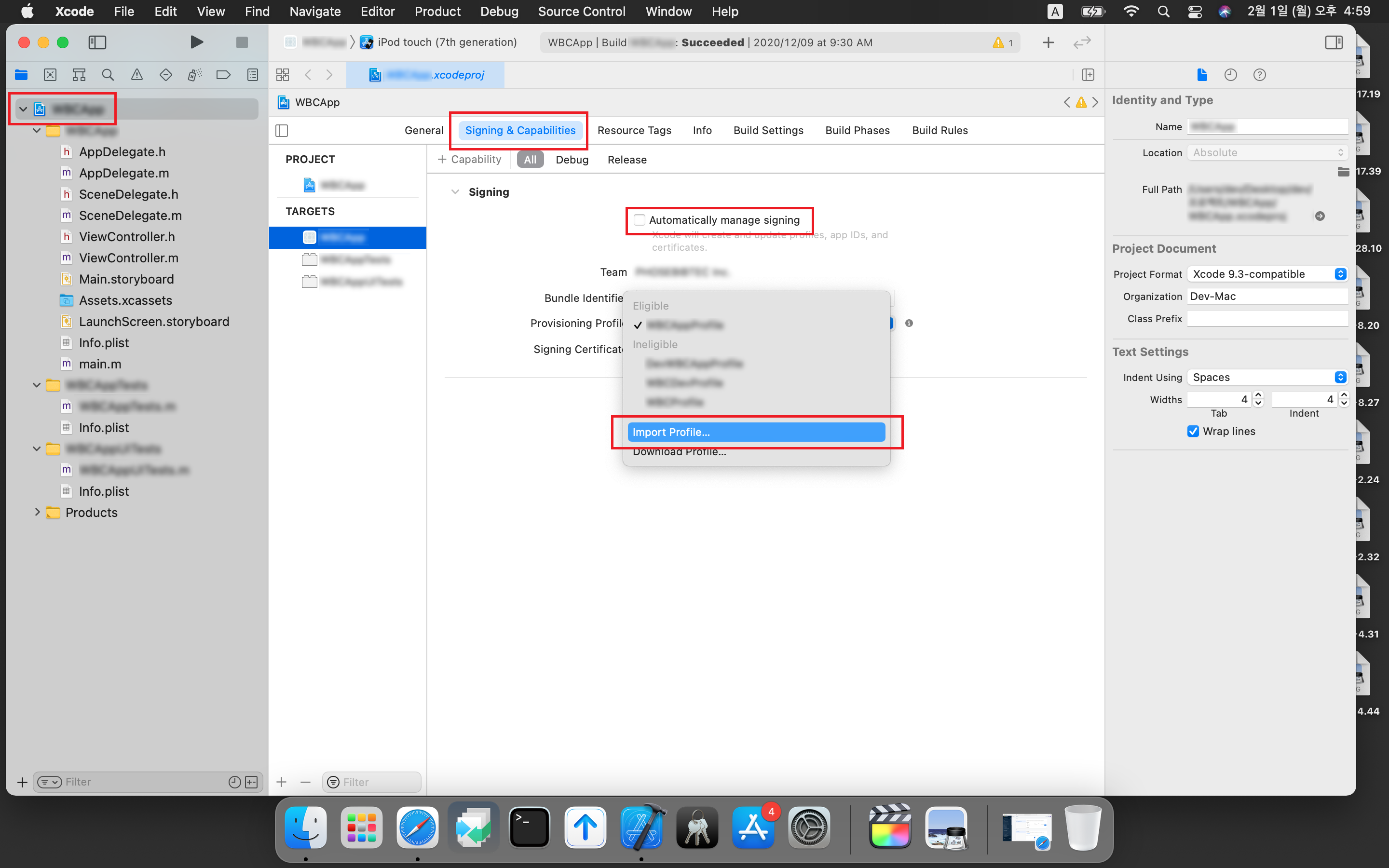 거기에서 등록한 개발 프로파일이 뜨지 않는다면 Automatically manage signing의 체크를 풀고, Import Profile… 버튼을 눌러 다운받아놓은 개발 프로파일을 추가해줍니다.