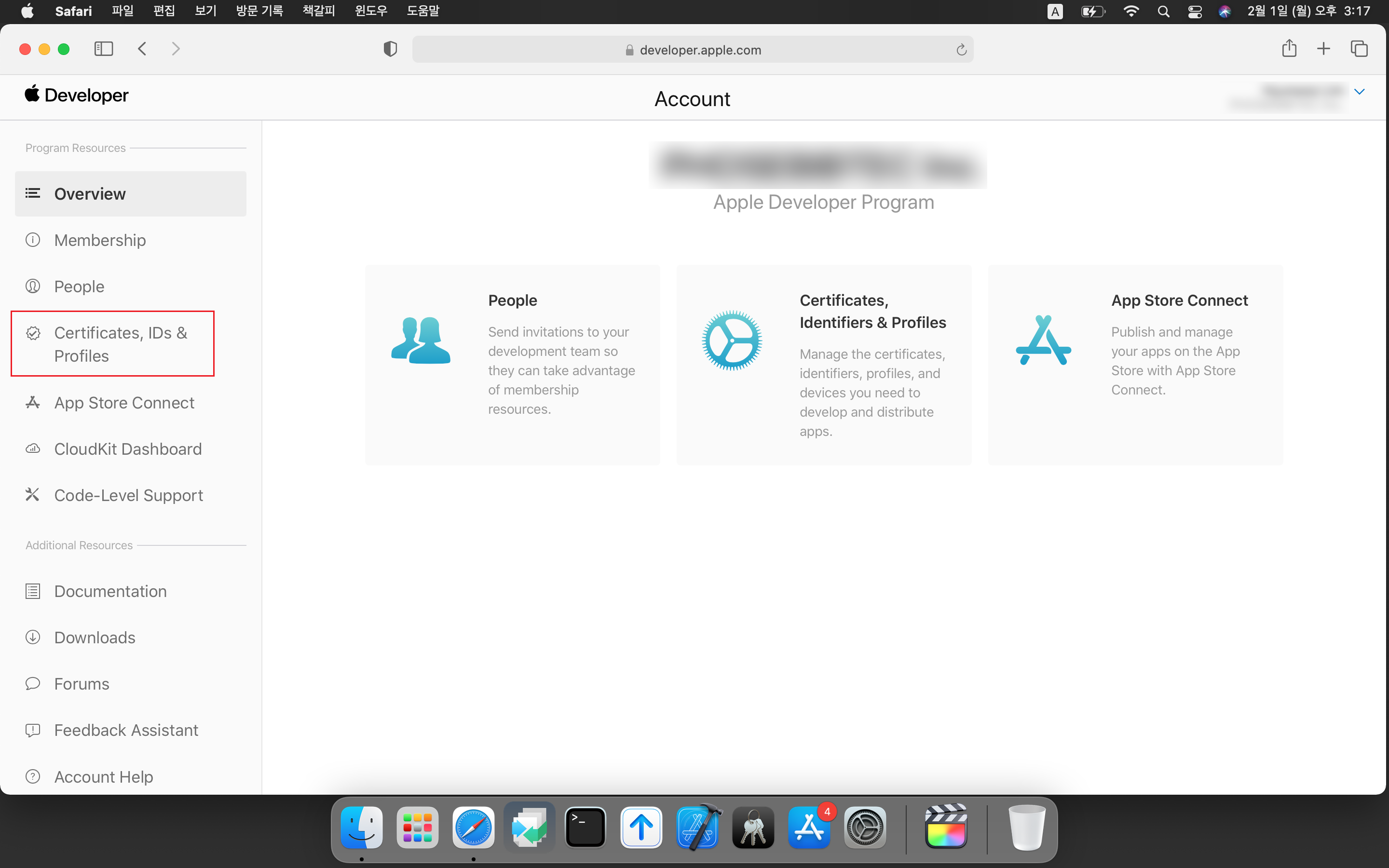 개발자 계정으로 로그인 후에 Account 메뉴를 선택하고 좌측의 Certificates, IDs & Profiles를 선택해 줍니다.