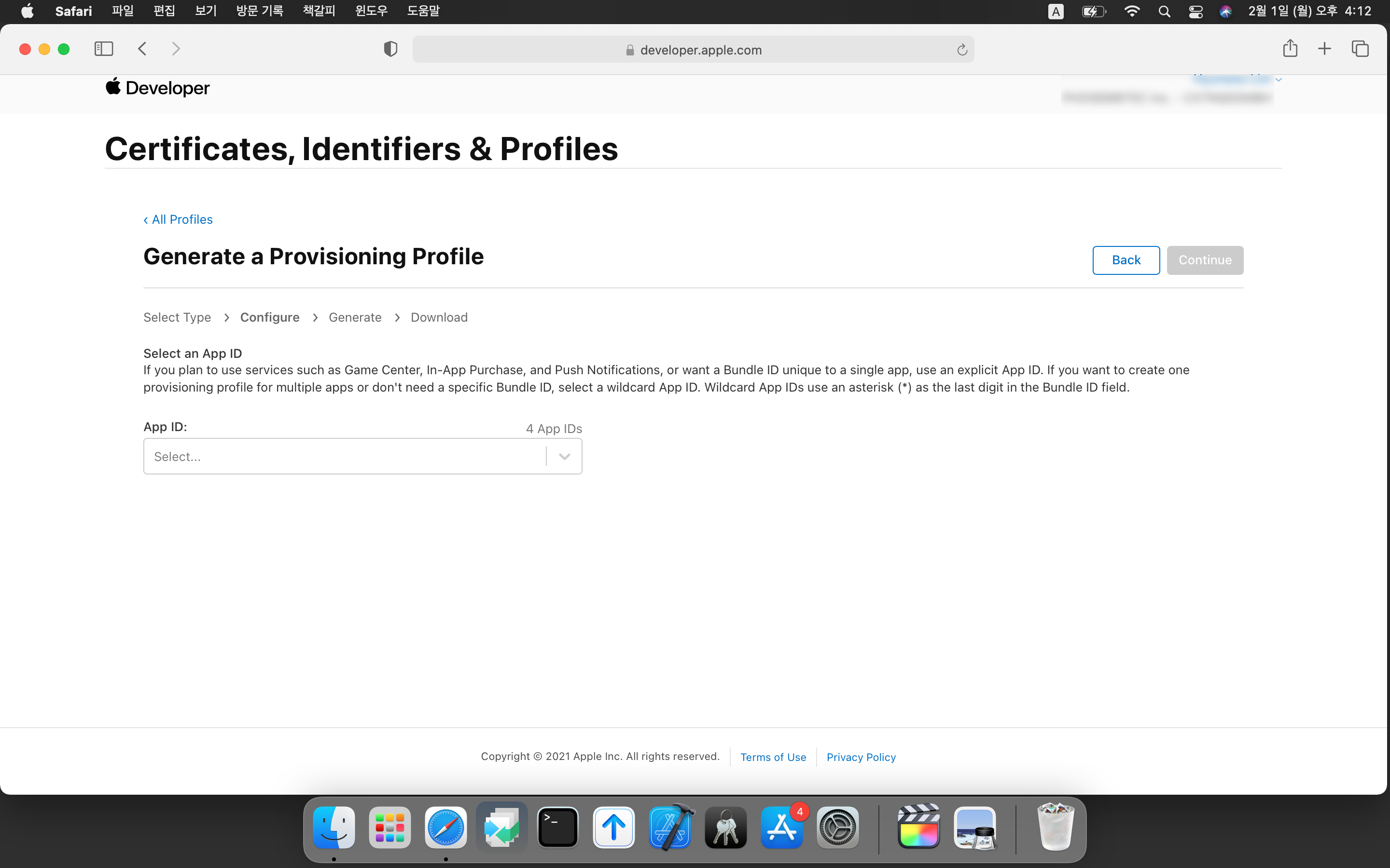 App IDs를 선택하고 Continue를 눌러 줍니다. App을 선택하고 Continue를 눌러줍니다.