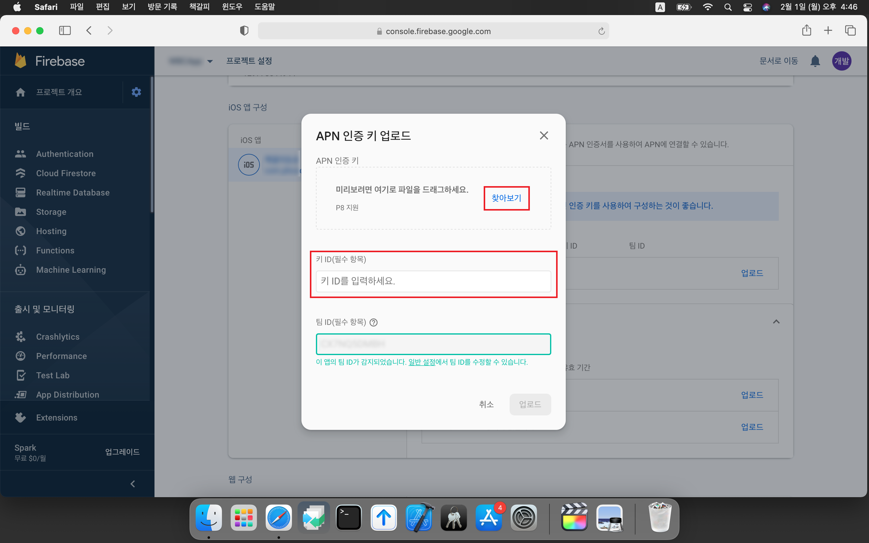 개발 과정에서 푸쉬 메시지를 매번 배포하면서 테스트 할 수 없기 때문에 개발 디바이스를 추가해주어야 하고, 푸시 메시지를 사용하기 위해 iOS용 키 파일을 저장하여 FCM에 등록해주는 작업이 필요합니다.