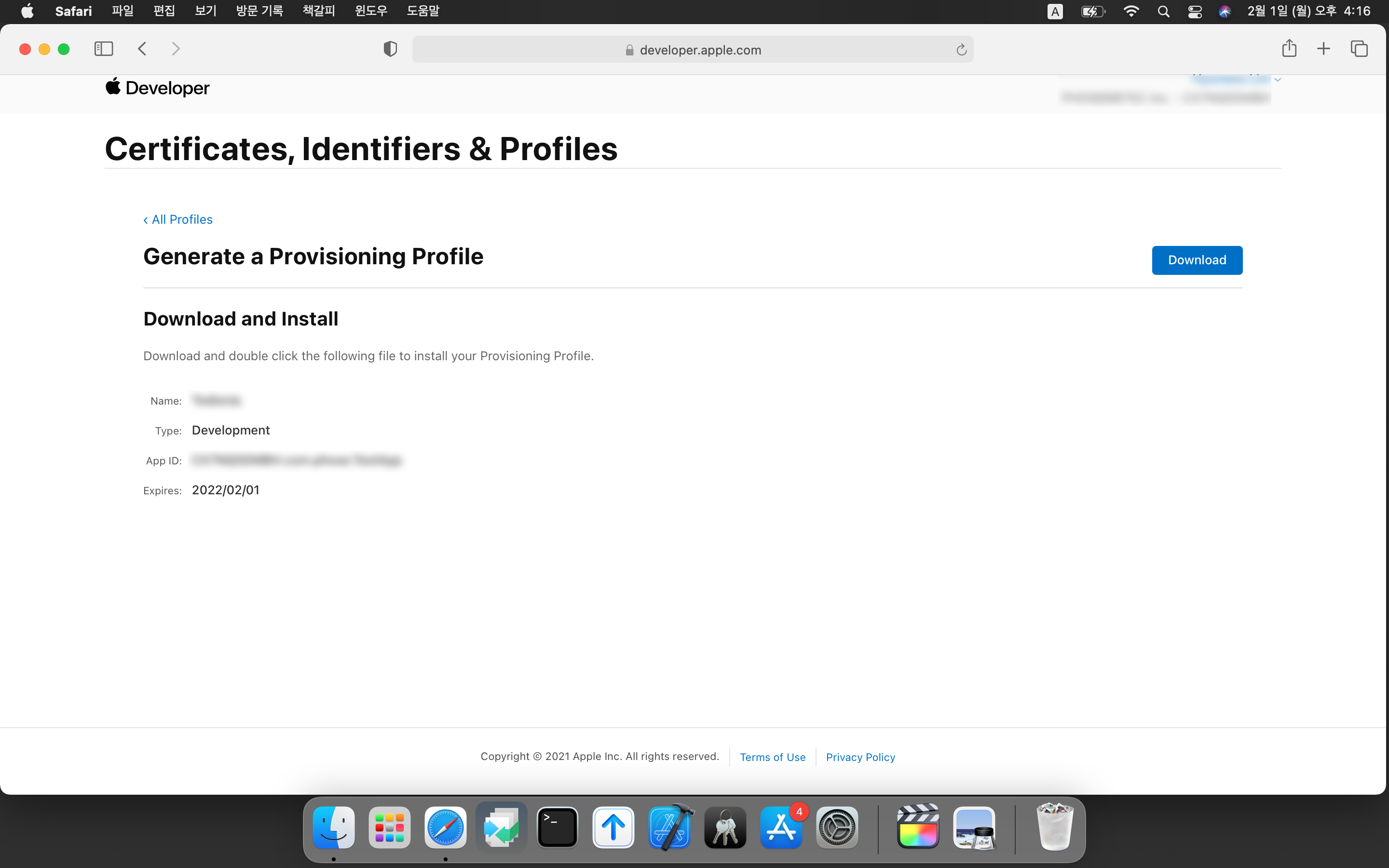 프로파일 명칭을 입력하고 Generate 버튼을 누른 뒤 Download 버튼으로 활성화되면 Download 버튼으로 인증서를 다운 받아 줍니다.