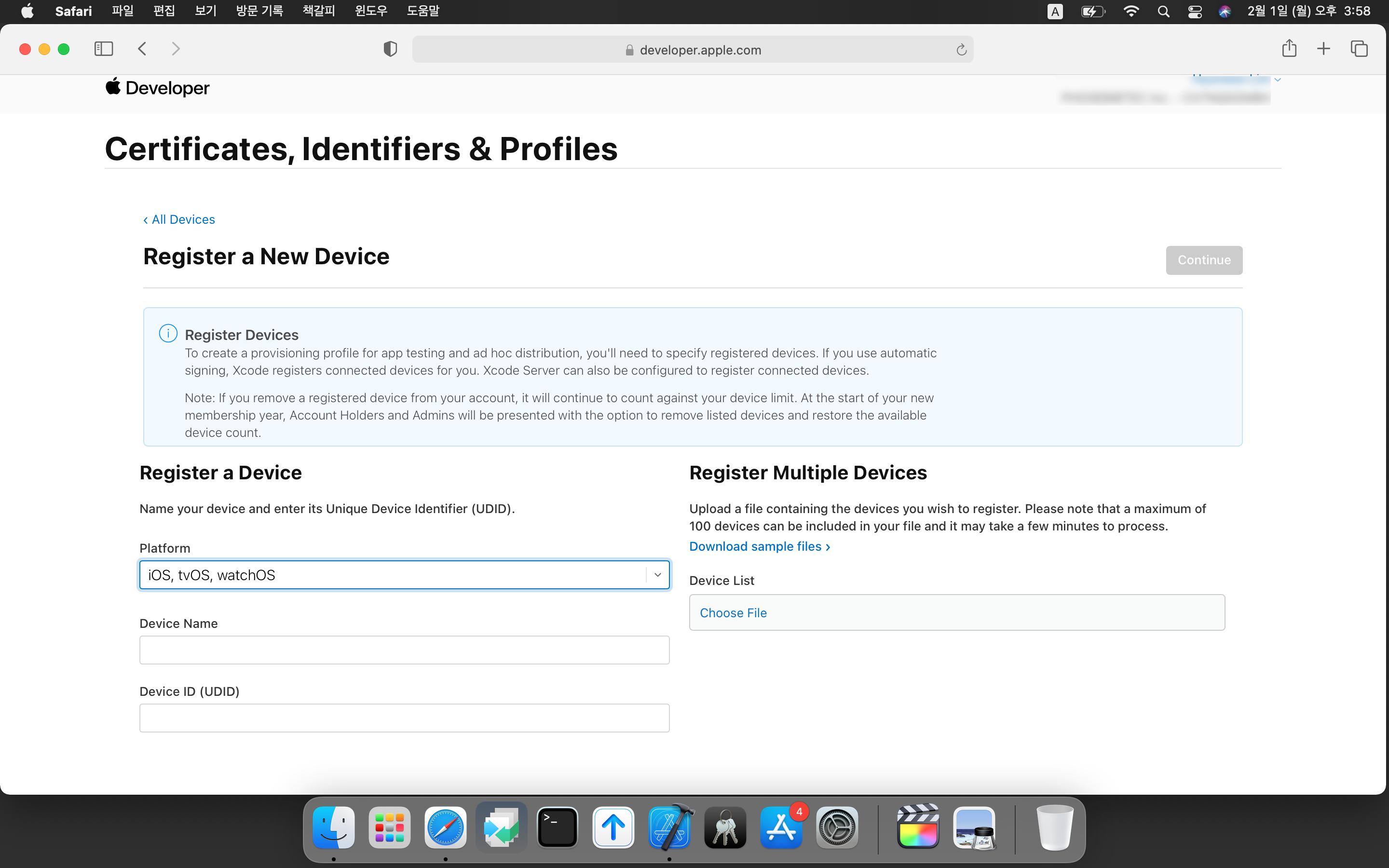 Device Name에 디바이스 명칭을 입력하고 Device ID는 맥북에 iPhose이나 iPad를 연결하고 XCode를 실행하여 확인이 가능합니다.
