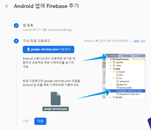 구성 파일 다운로드에서 google-services.json 다운로드 버튼을 눌러 json 파일을 다운 받아줍니다.