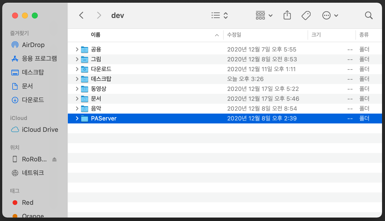 상위 폴더로 이동이 되면 PAServer 폴더가 보이게 됩니다. 아래와 같이 PAServer > scratch-dir > MacBook 경로로 이동해 줍니다.