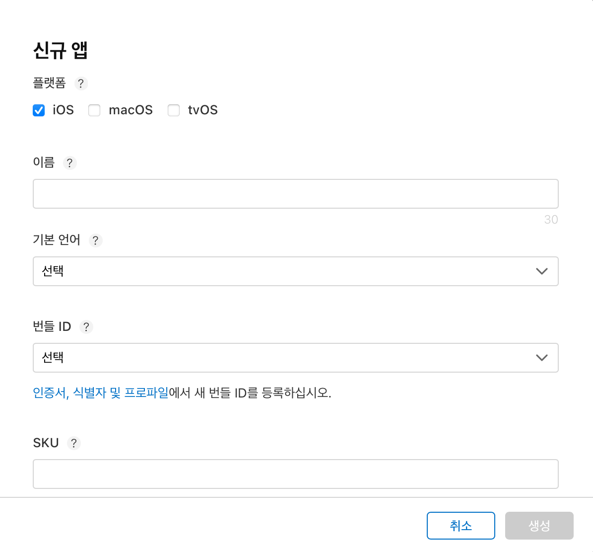 앱 이름과 기본 언어, 번들 ID와 SKU를 입력해줍니다. 개발자 사이트에서 앱 아이디를 만들었기 때문에 번들 ID에 만들어져 있는 앱 아이디 목록이 표시됩니다. 이때 SKU의 경우 특정 인식 번호라고 보면 되며 영문자와 숫자를 혼용해서 사용 가능합니다.