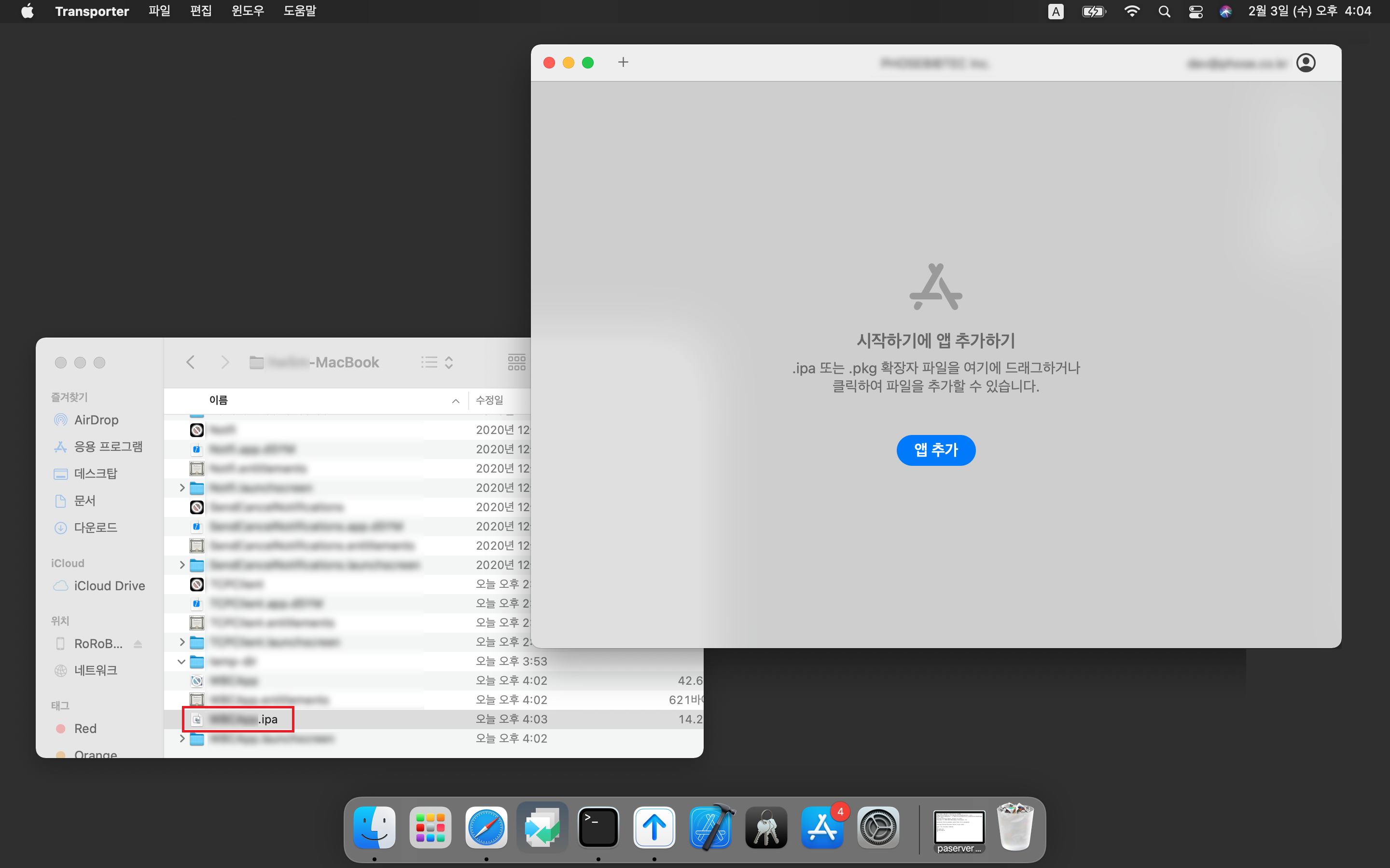 폴더를 열면 방금 빌드한 프로젝트의 .ipa 파일이 존재하는 것을 볼 수 있습니다. Transporter 앱을 실행하여 애플 개발자 계정으로 로그인해줍니다.