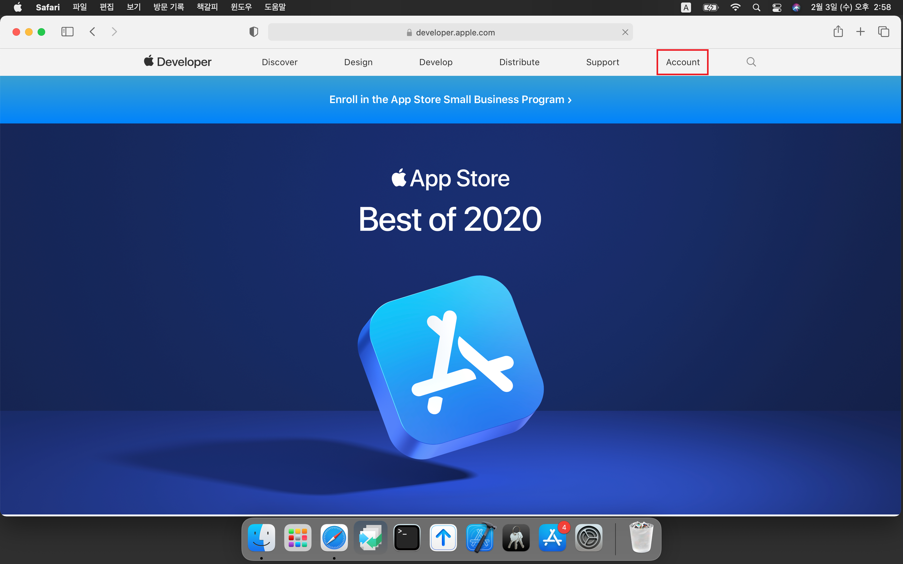 애플 개발자 사이트에 접속하시면 아래 화면을 볼 수 있습니다. Account 메뉴를 눌러줍니다.