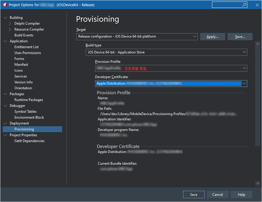 좌측의 Deployment - Provisioning에서 iOS Device 64-bit - Application Store를 선택하면 PAServer가 실행되어 있다면 위에서 만든 배포용 프로파일이 표시되는 것을 볼 수 있습니다.