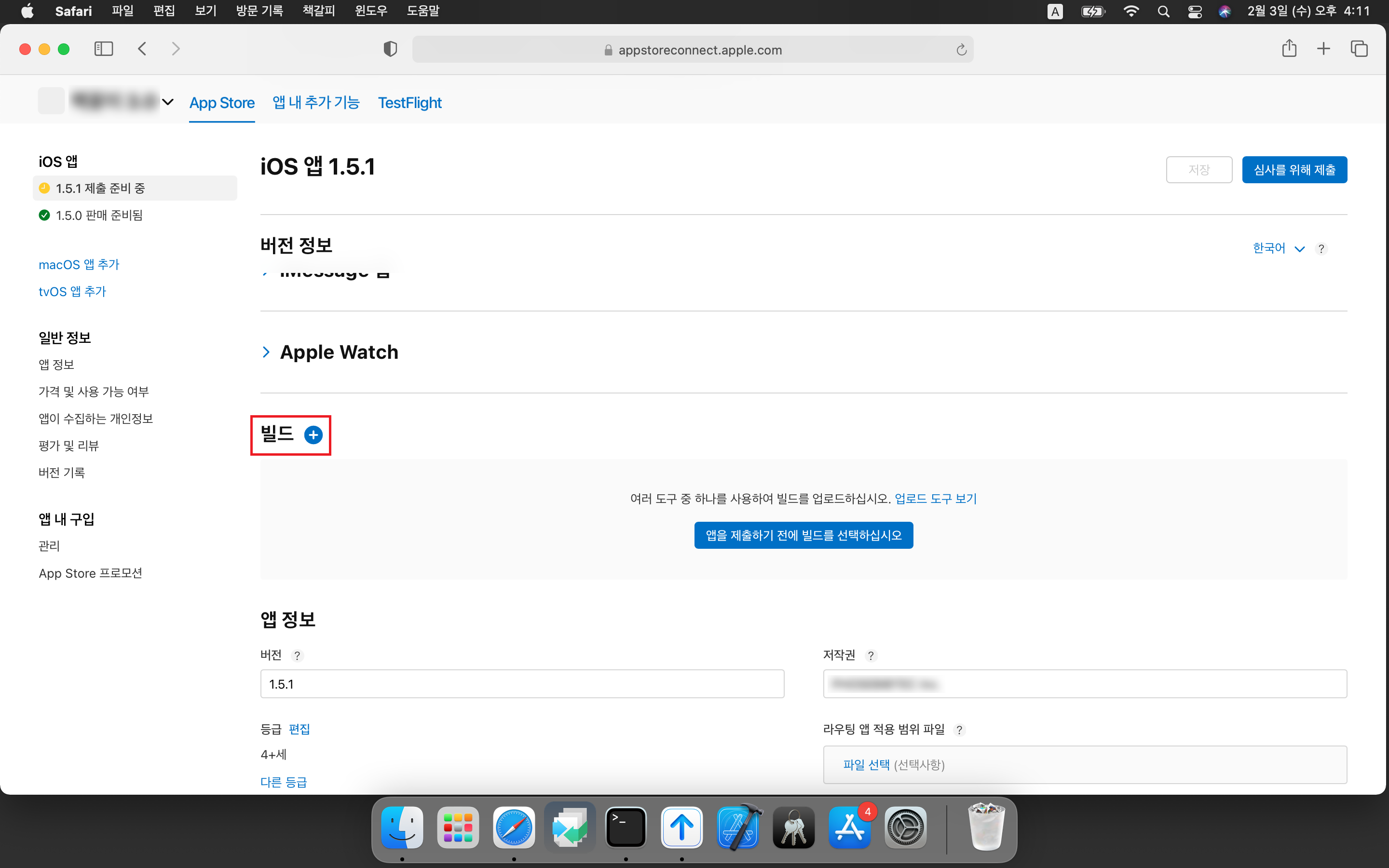 맥북에서 Transporter 앱을 통해 ipa 파일을 전송하였다면 빌드 부분에 + 기호가 표시되는 것을 볼 수 있습니다.